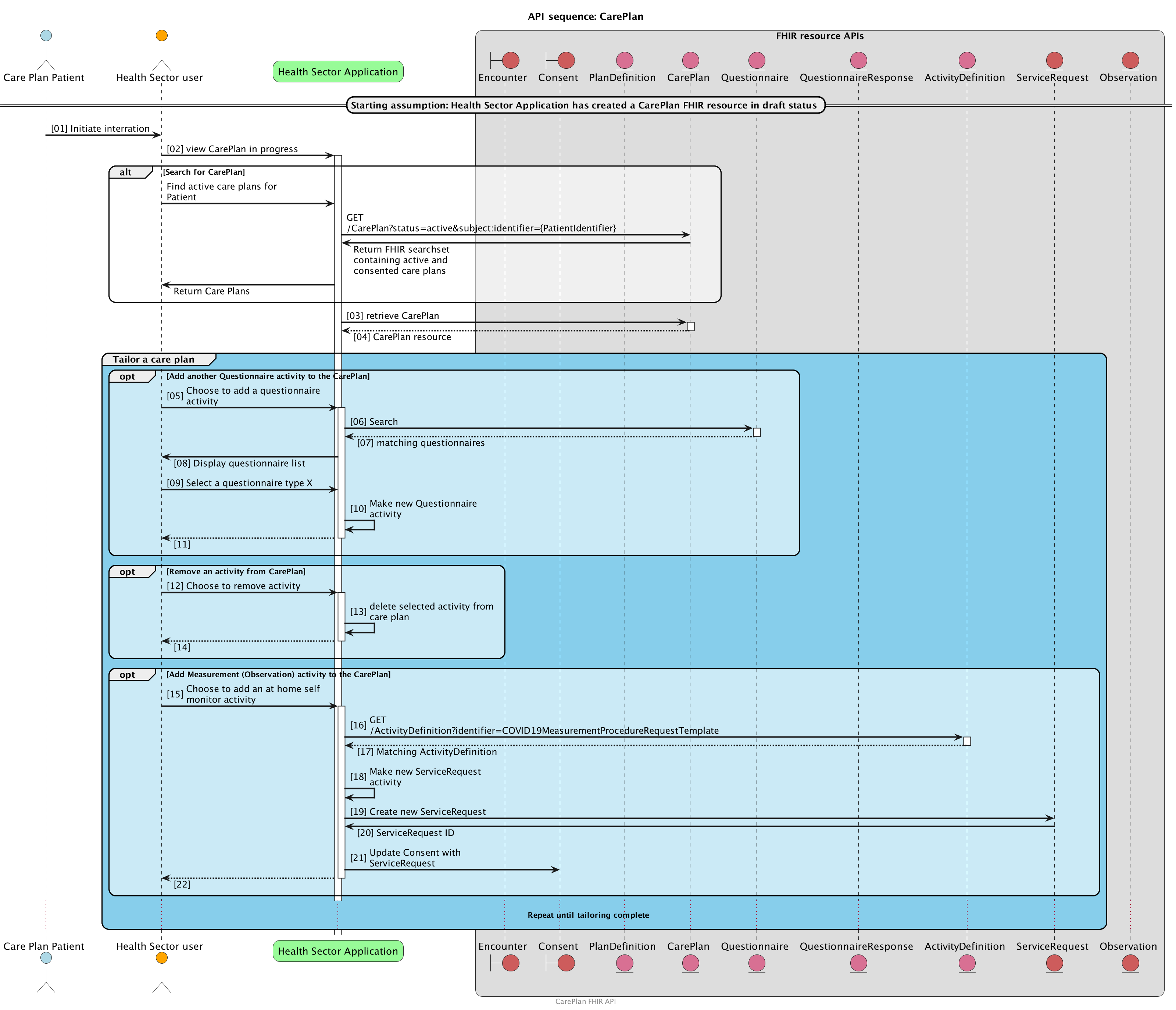 The CarePlan Service API Sequence involves the following main steps: