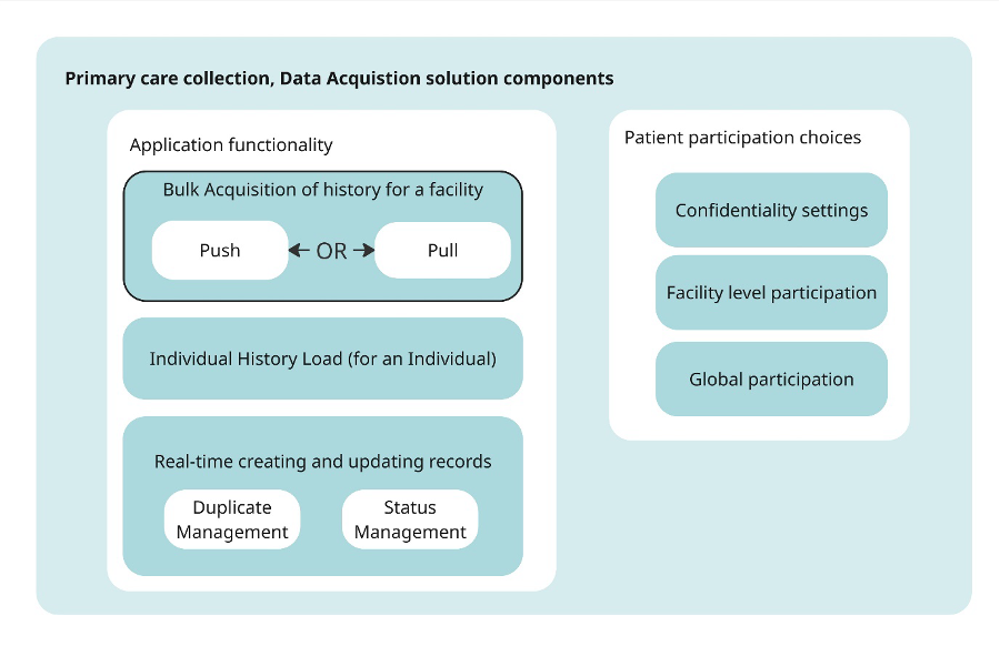 There are two designs for the initial bulk acquisition of historical data from a facility when it first is connected to SDHR. These are referred to as either the Push-based or the Pull-based;
